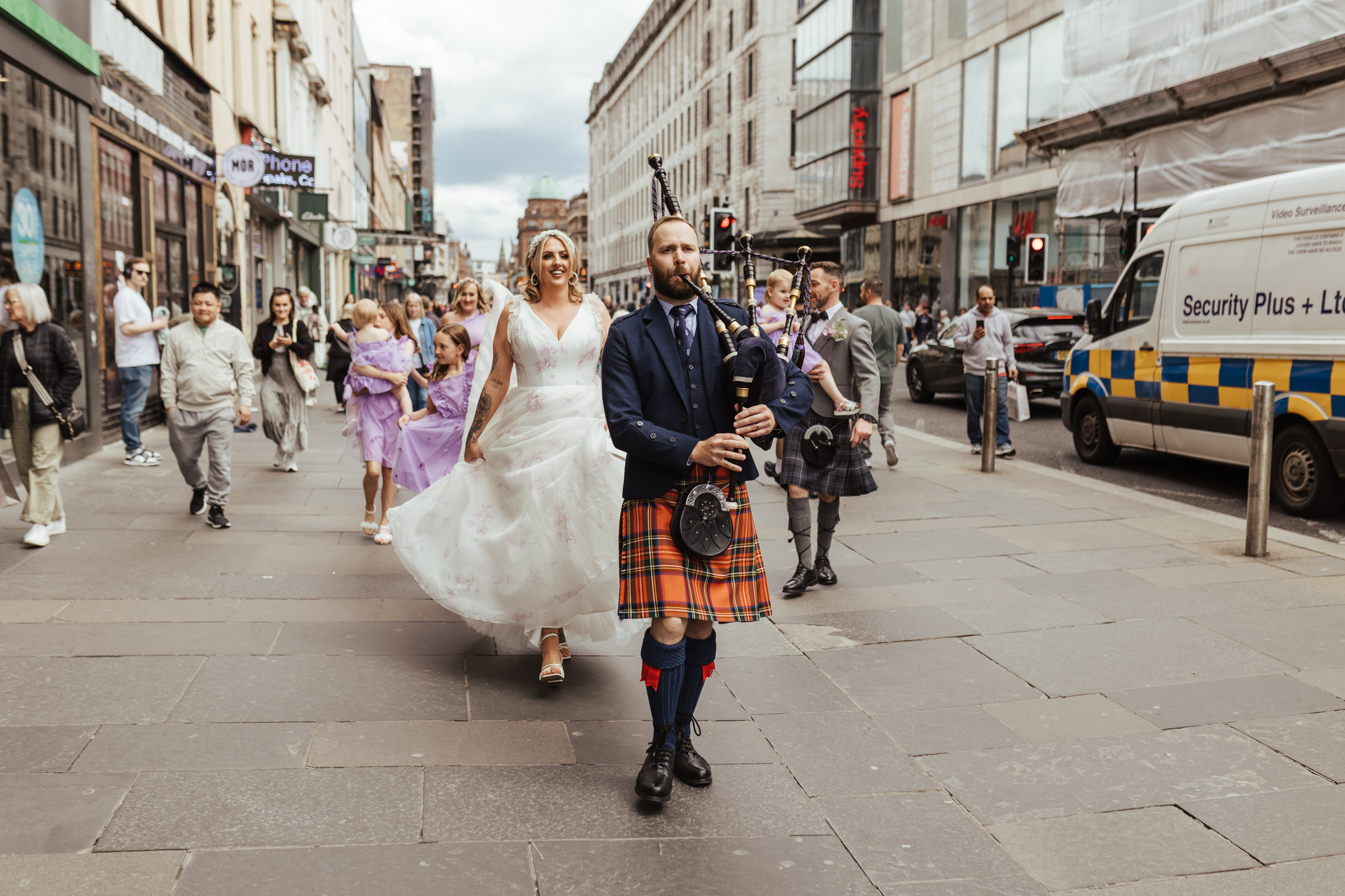 The piper piped them from Sloan’s, around the corner to one of the busiest streets in Glasgow for some group shots, and the next bit could NOT have been more brilliant! There was a Pipe Band (The Isle of Arran Music School Pipe Band) playing just up the street, and word has it that the Groomsman paid them £100 to come and pipe for Sam & Bob! Well….if this isn’t every photographers dream, I don’t know what is! The Pipe Band played a few tunes while Sam & Bob danced on Glasgow’s Buchana Street and they gathered quite the crowd! For a couple who mainly wanted candid photos, this could not have gone better!