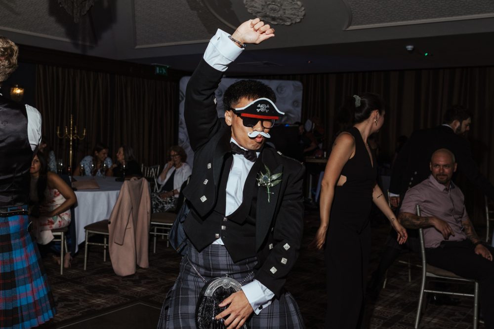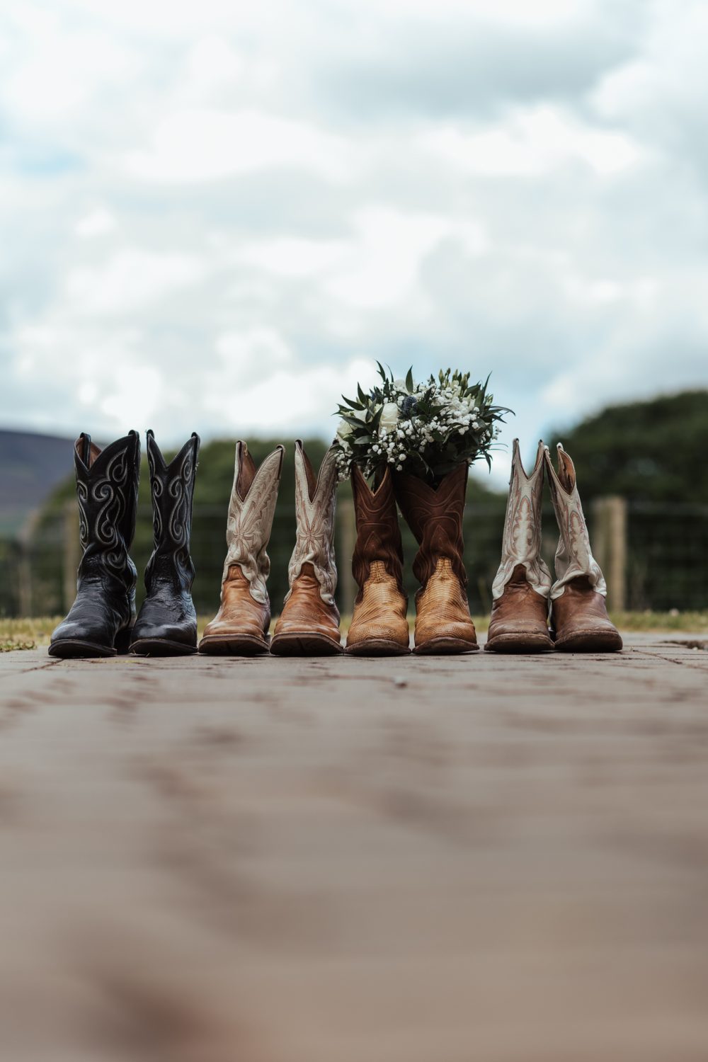 I knew from the beginning that I wanted a shot with all the cowboy boots and the flowers, and I was touched to know that Jake’s boots had belonged to his Grandad (who features on the kilt pin) so I made sure the get that too. Sophie had also planned that the only Scot/Texan (who didn’t have a cowboy hat or boots) would have a ‘See You Jimmy’ Hat & wellies for the cowboy hat shot. which properly tickled Jake!